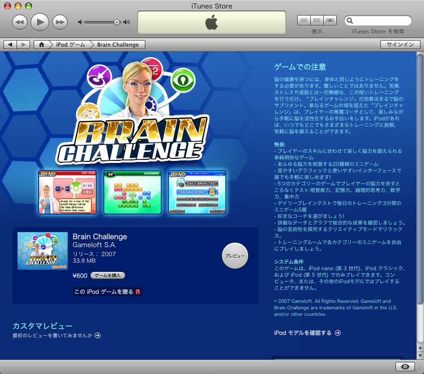 - 新しいiPodゲーム“Brain Challenge”(ブレインチャレンジ)が販売されています。20種類のミニゲームが入った脳トレゲームです。第5世代iPod、iPod classic、第3世代iPod nanoでプレイできます。