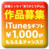 あなたとiPodのエピソードを、ぜひ投稿してください。あなたの作品に広告が付くと、1,000円分のiTunesギフトがプレゼントされます。