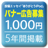 投稿エッセイ集「ありがとうiPod」では、ご協賛いただける企業、団体を募集しています。低コストで長期間にわたりiPodユーザに対し掲示されるので、iPod関連製品の訴求に最適です。