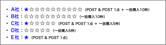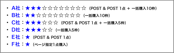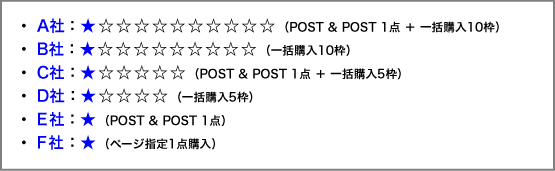 - E社とF社は、一括購入スポンサーのA社〜D社の広告掲載数を追い越して、2点目の掲載を申し込むことはできません。