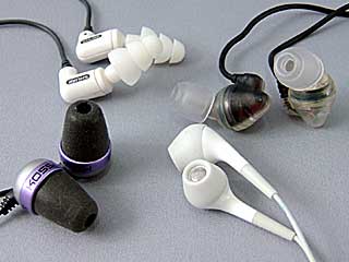 iPodユーザには「カナル型」と呼ばれるタイプのイヤホンが人気です。耳に入れる部分がスポンジやゴムの耳栓状になったものです(写真)。遮音性が高いので、電車の中などで騒音を防ぐことができ、また音漏れ(シャカシャカ音)で周りに迷惑をかけることも無くなります。