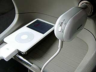 2「FMトランスミッタ」は、iPodに接続して、音楽をFM電波で飛ばすためのもの。カーオーディオのFMラジオで音楽を聴けます。電波に乗せるので音質は若干下がり、ノイズを拾うこともあります。クルマのアンテナ位置や、周辺の電波状況にも影響されます。です。