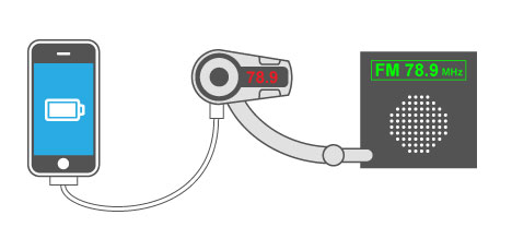 クルマのシガーソケットに接続し、Bluetoothで受信したiPhoneなどの音楽を、FM波で発信してクルマのFMラジオで聞くことができます。