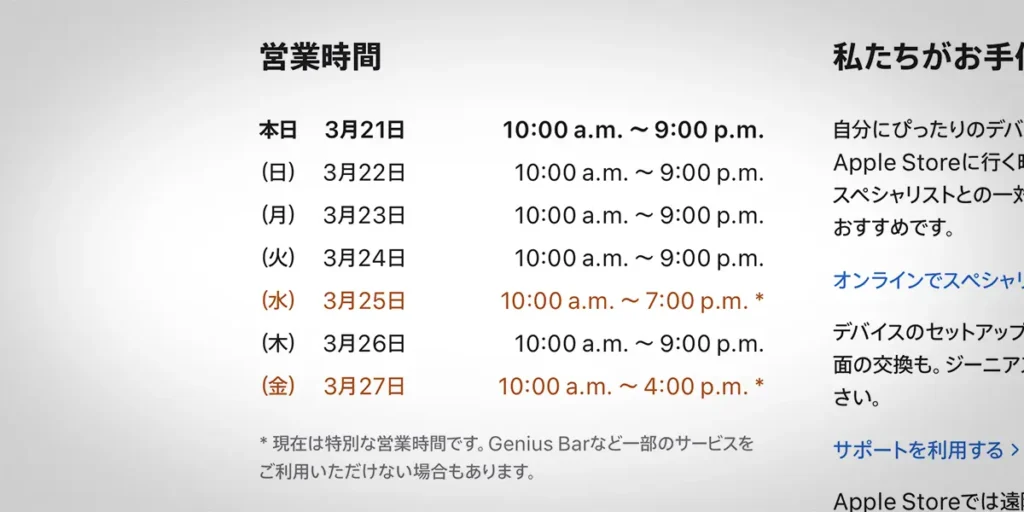 Apple梅田が3月24日(火)に、心斎橋と京都が25日(水)に短縮営業を実施。19時で閉店に