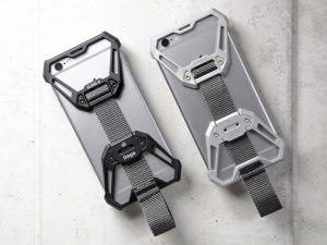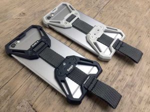 ステンレス製のパーツをiPhoneの上下に被せて、ベルトで締めるように固定します。
