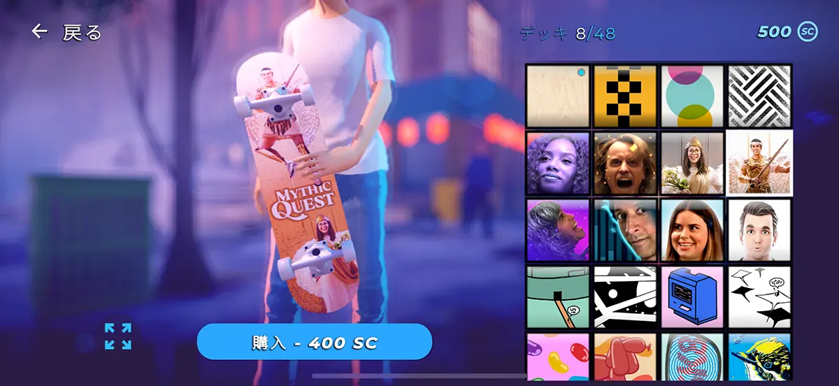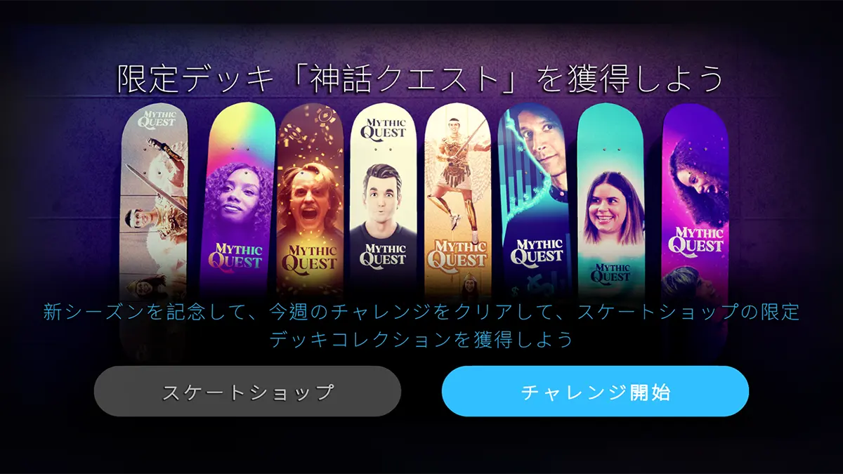「限定デッキ」として、「神話クエスト」のデザインが施されたカスタムスケートボードセットが入手できます。