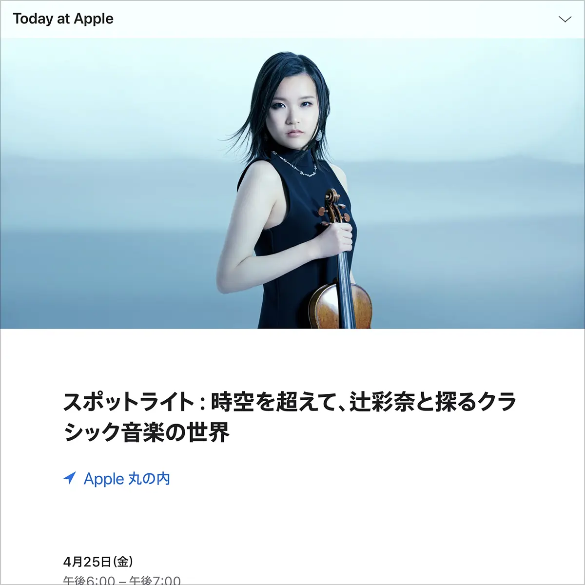 Apple丸の内でToday at Appleセッション「スポットライト:時空を超えて、辻彩奈と探るクラシック音楽の世界」が、4月25日(金)に開催されます。