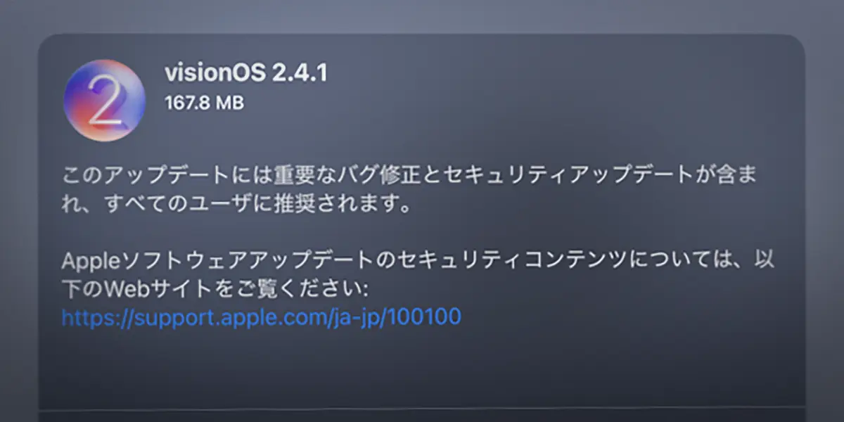 Apple Vision Pro用の「visionOS 2.4.1」ソフトウェアアップデートが公開されています。