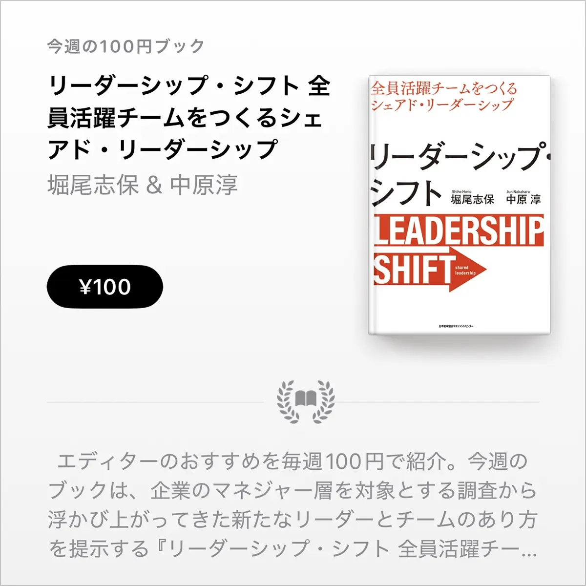Apple Books Storeで「今週の100円ブック」として、堀尾志保・中原淳著「リーダーシップ・シフト 全員活躍チームをつくるシェアド・リーダーシップ
