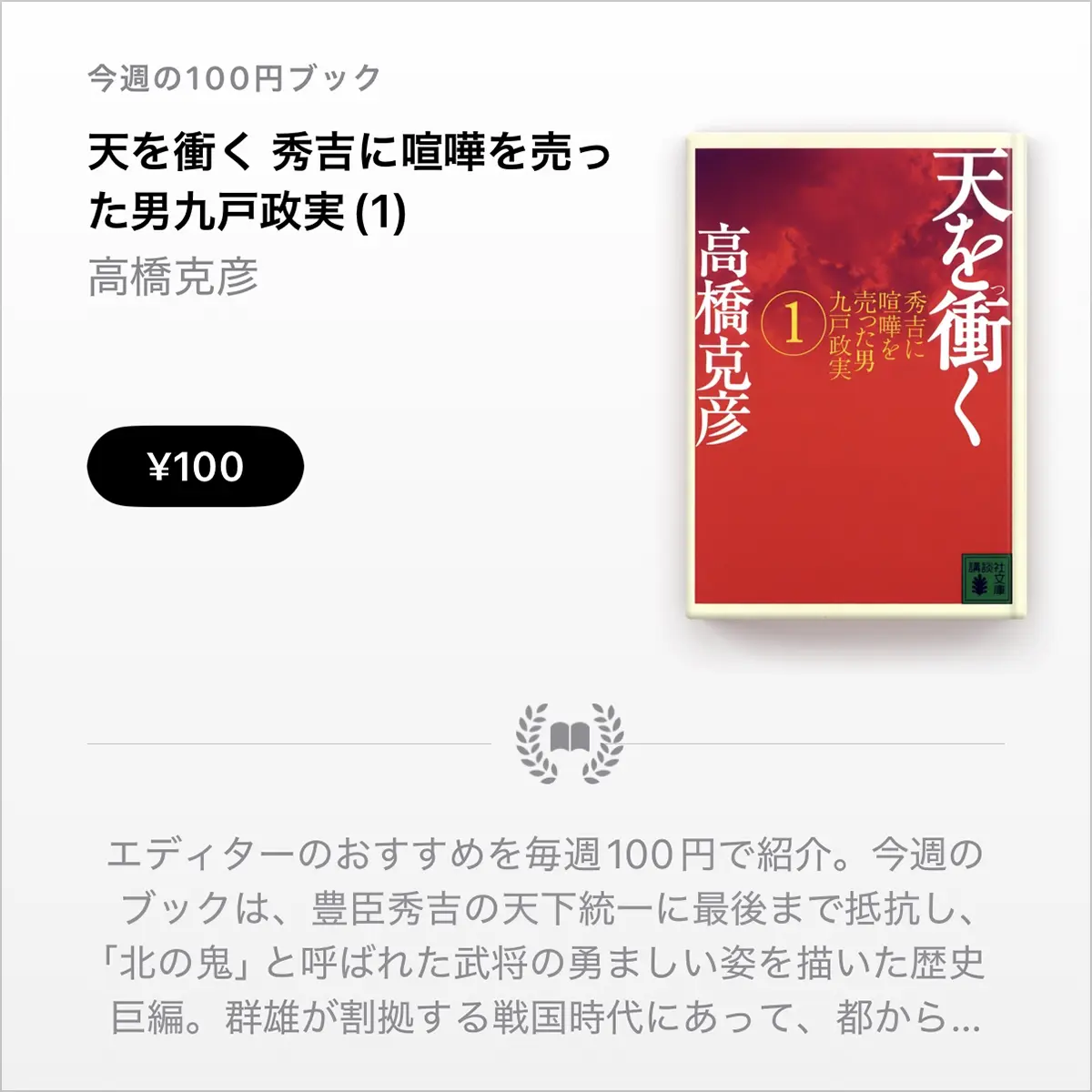 Apple Books Storeで「今週の100円ブック」として、高橋克彦著「天を衝く 秀吉に喧嘩を売った男九戸政実
