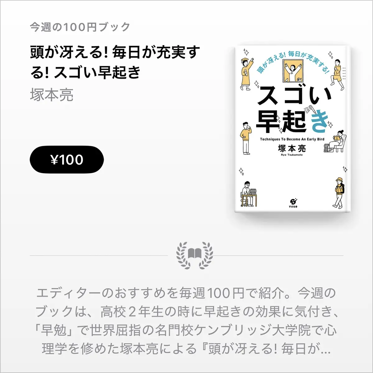 Apple Books Storeで「今週の100円ブック」として、塚本亮著「頭が冴える! 毎日が充実する! スゴい早起き