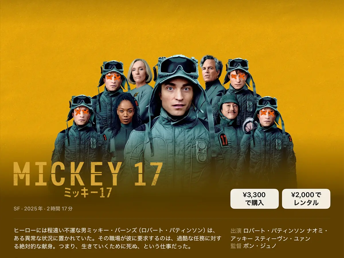 Apple TVアプリで映画「ミッキー17」が配信開始されています。
