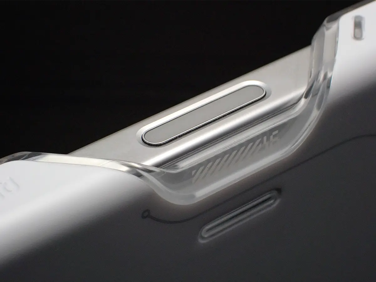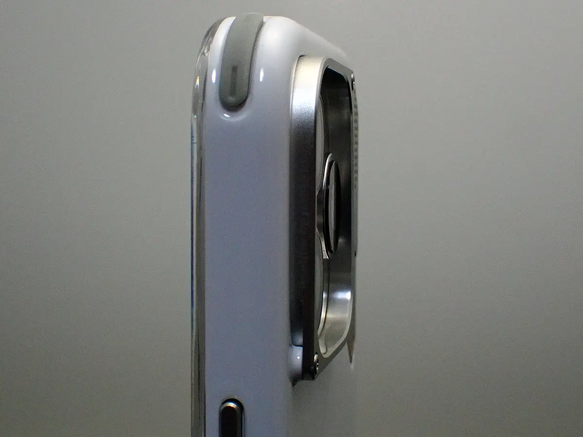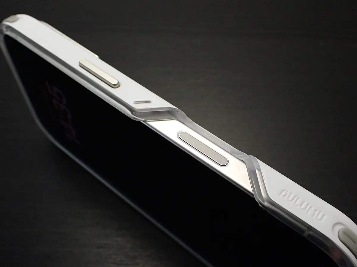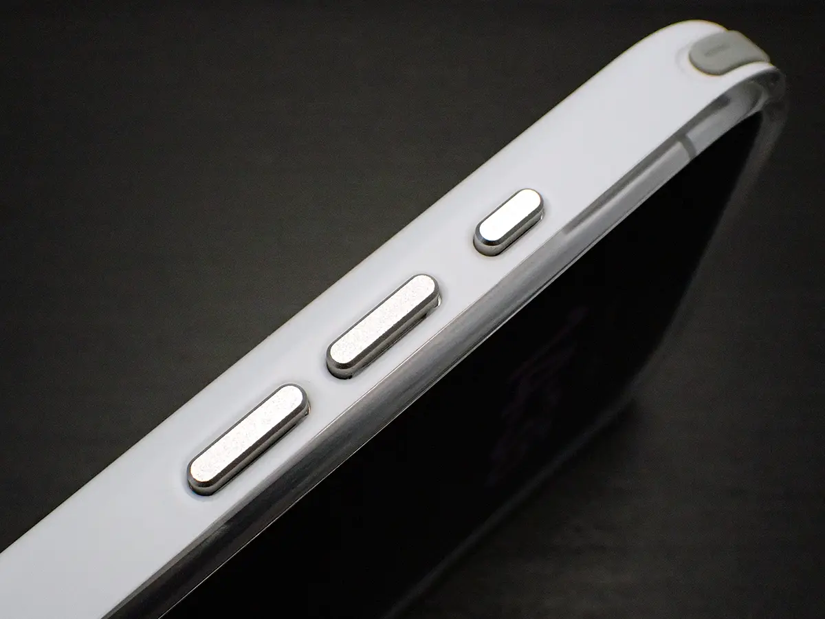 ▲ アクションボタンと音量ボタン部分にも、アルミ製のボタンパーツが使われています。
