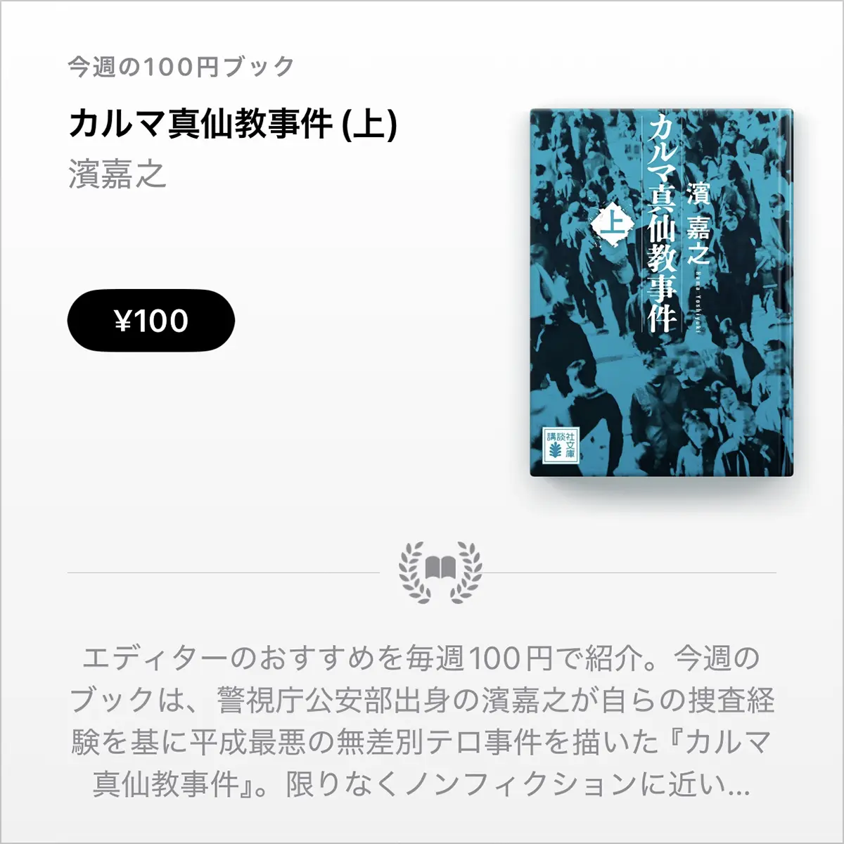 Apple Books Storeで「今週の100円ブック」として、濱嘉之著「カルマ真仙教事件
