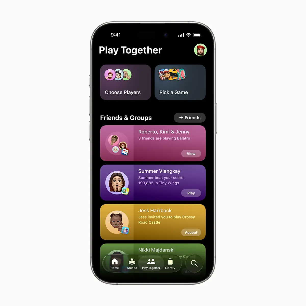 「Play Together(一緒にプレイ)」タブでは、友達とスコアを競ったり、プレイ履歴の共有、ゲームへの参加依頼ができます。