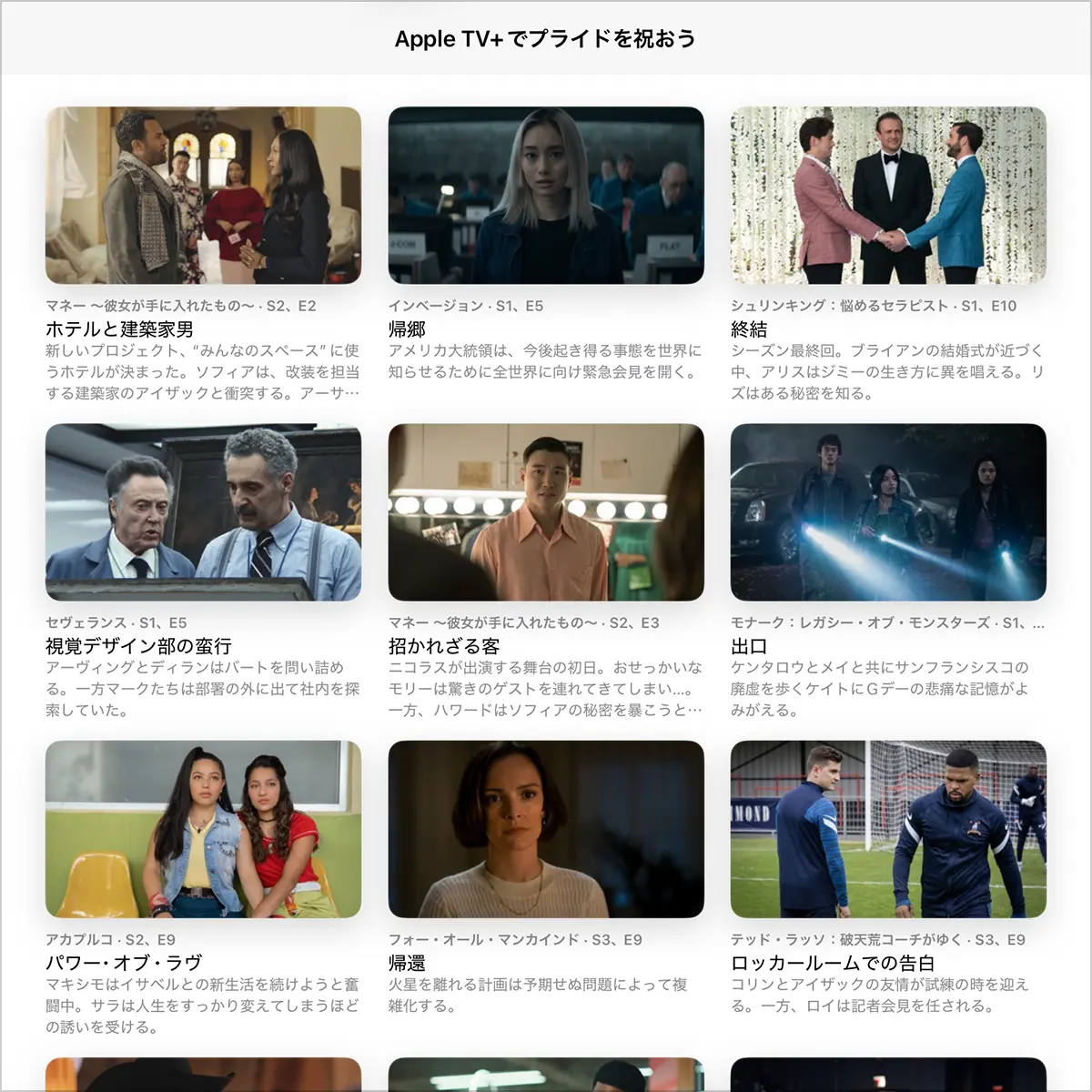「Apple TV+でプライドを祝おう」では、Apple TV+のドラマとドキュメンタリーから、LGBTQ+関連のエピソードが紹介されています。