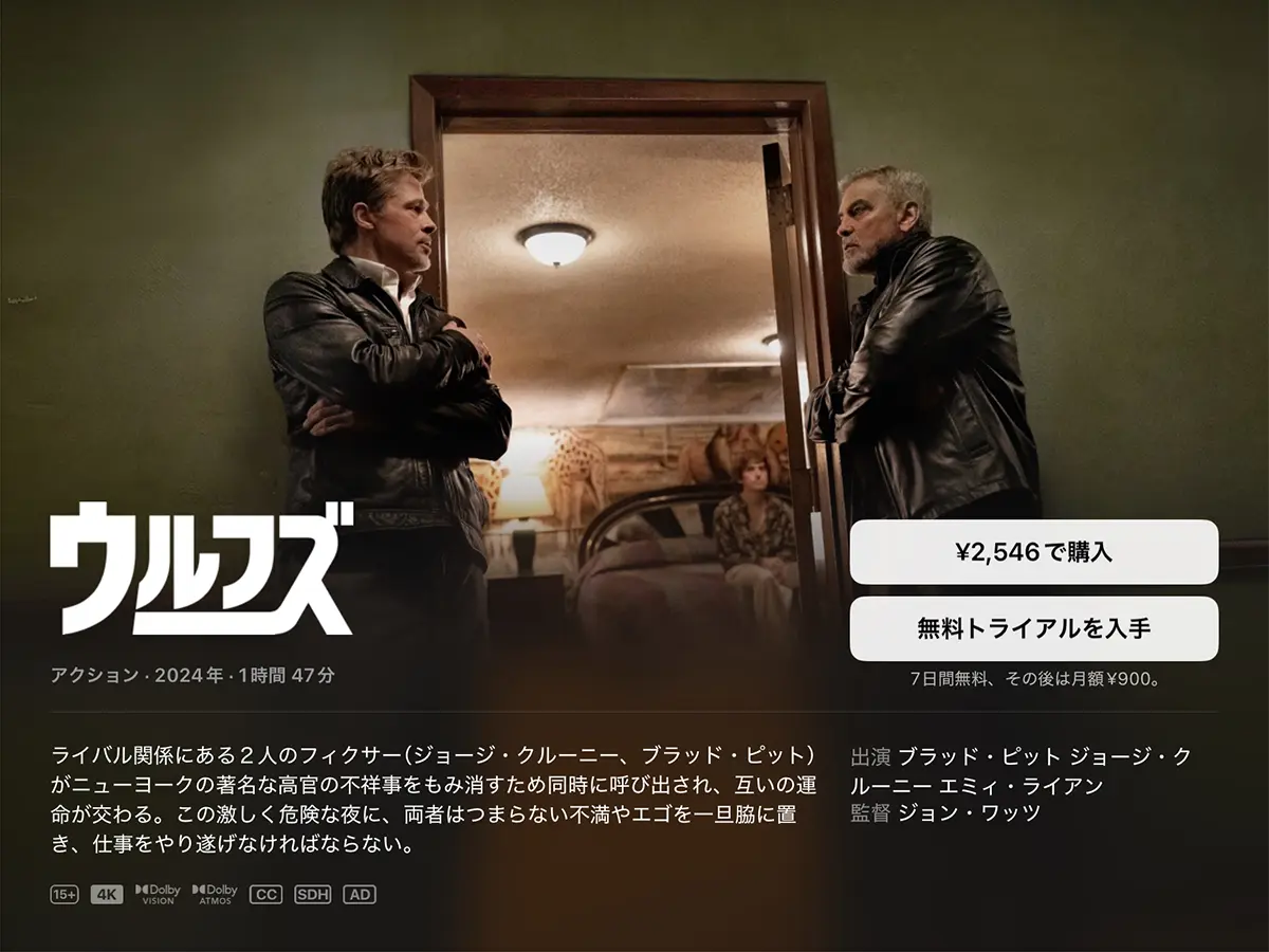 ブラッド・ピットとジョージ・クルーニーが主演するApple Original映画「ウルフズ」が、Apple TVアプリで購入できるようになりました。