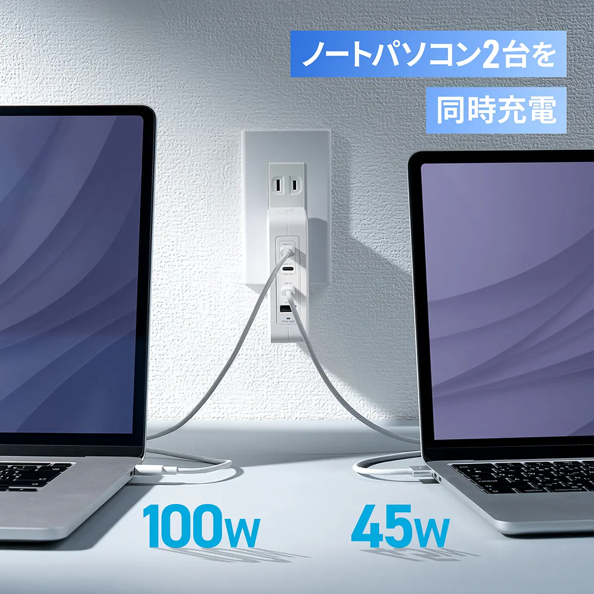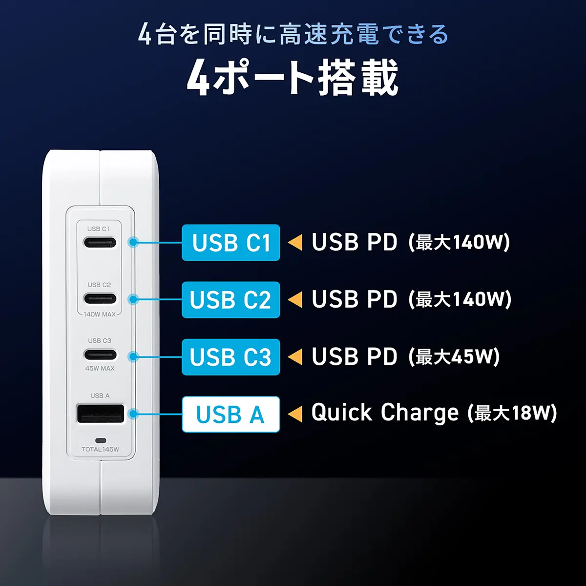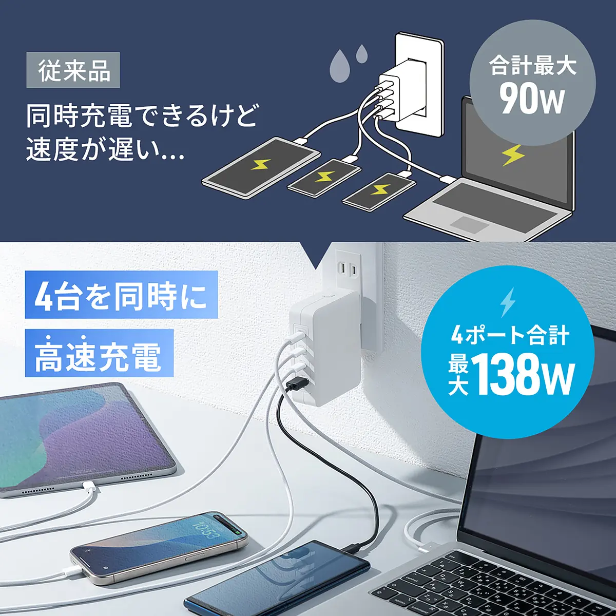 4台のデバイスの同時充電にも対応し、4ポート同時使用の場合は合計最大138Wになります。