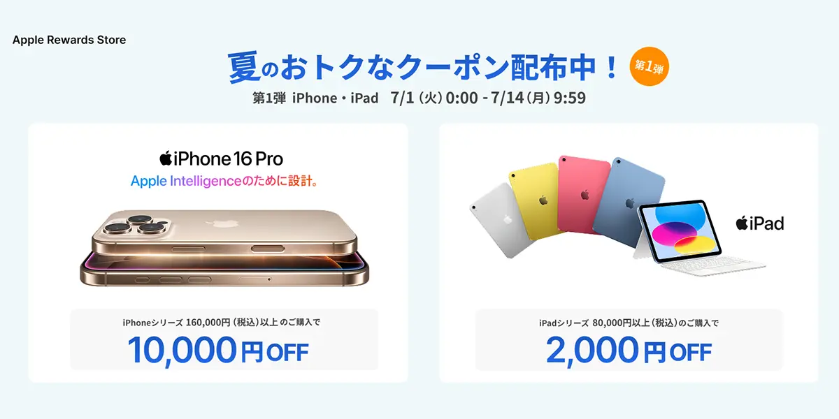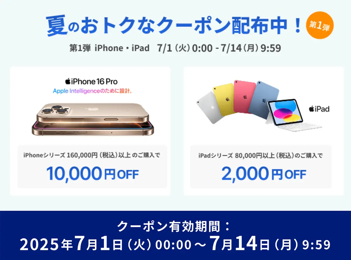 「夏のおトクなクーポン」第1弾として、iPhone用、iPad用の割引クーポンが公開されています。