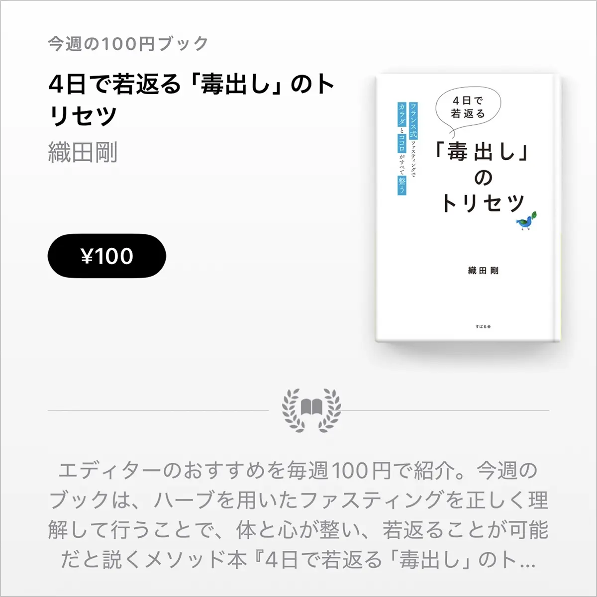 Apple Books Storeで「今週の100円ブック」として、織田剛著『4日で若返る「毒出し」のトリセツ