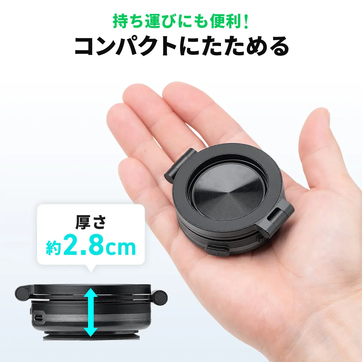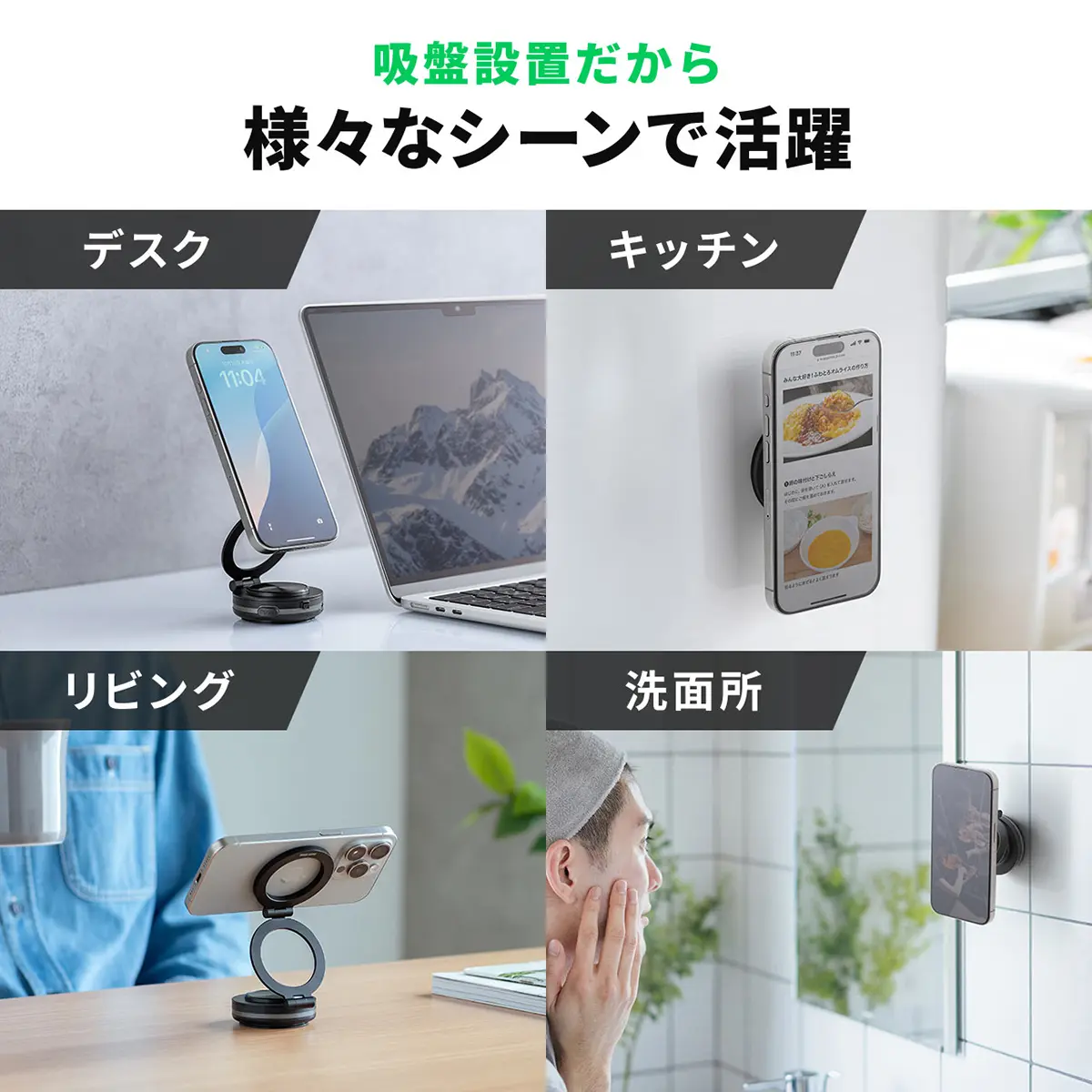 サンワサプライが電動吸盤を使用したMagSafeスタンド「200-STN091BK」を発売しています。