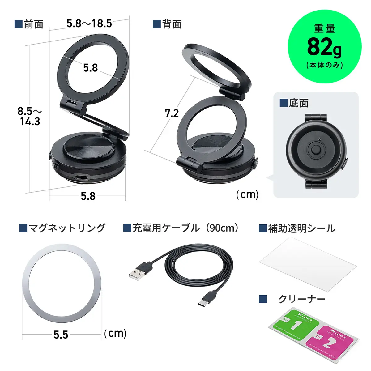 充電用ケーブルと、MagSafeに対応していないデバイスやケースで使えるようにするマグネットリング、吸盤が吸着しにくい面に貼って使う補助シールが付属しています。