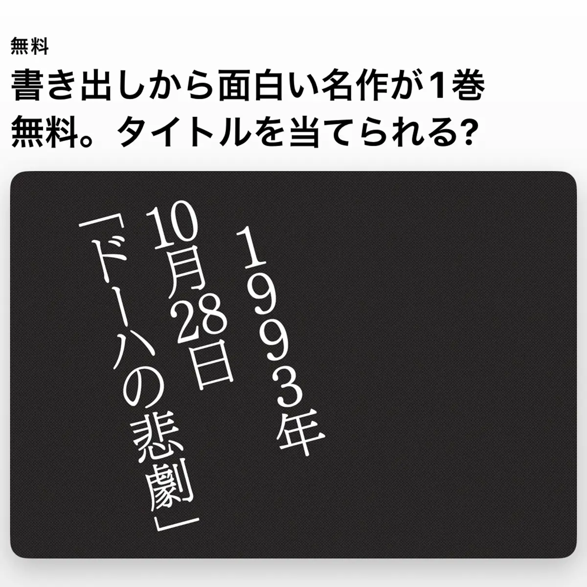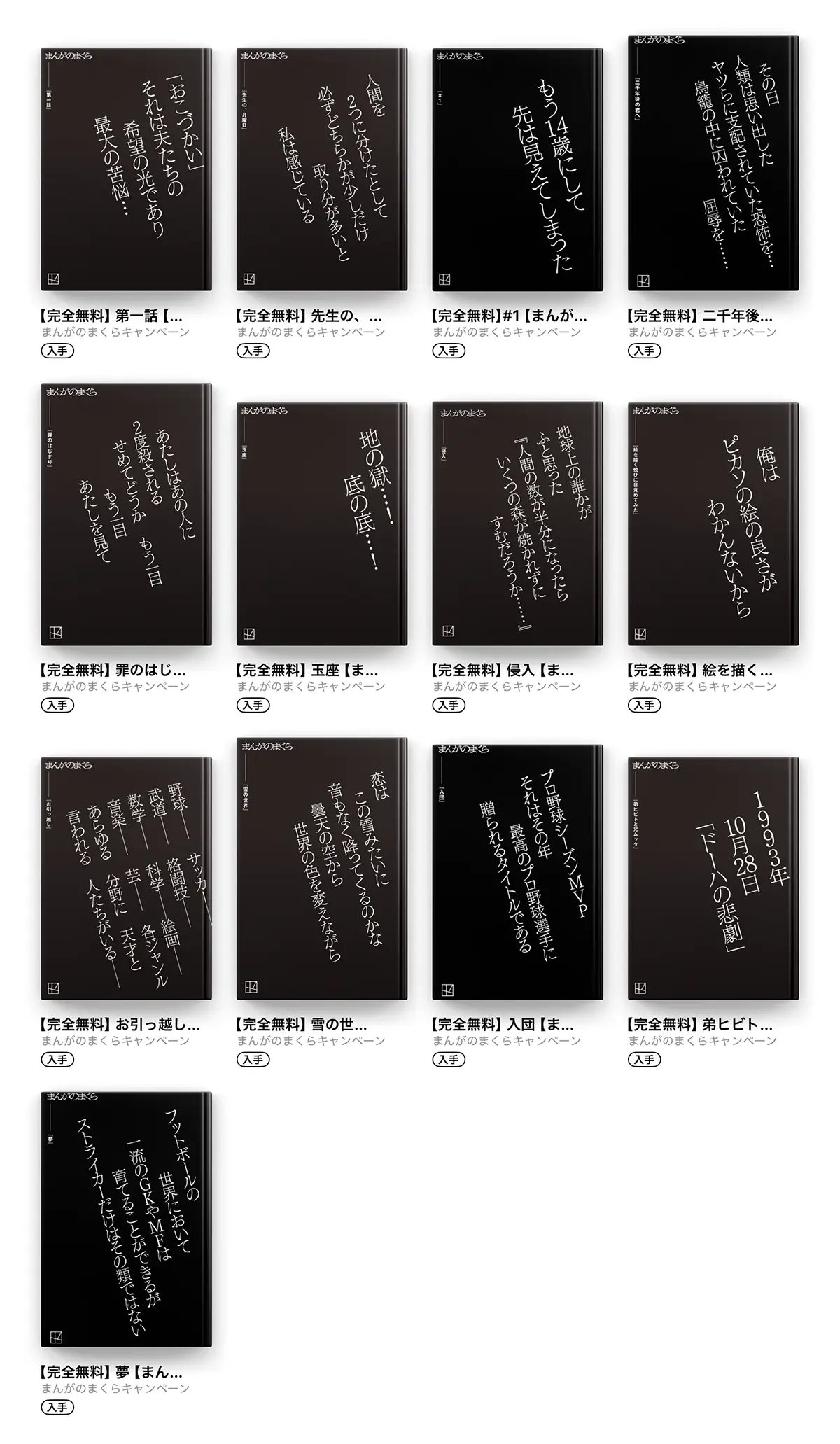その一言が、あなたの人生を動かすかもしれない。マンガのセリフや冒頭の書き出しには強烈な力が潜んでいる。音楽でいえばラップにおけるパンチラインやお気に入りのヒットソングの歌詞と同様に、それらはパワフルでキャッチーでかつ奥深い、一種のアートとも呼べるもの。マンガの作家が自らの作品に懸ける意気込みが凝縮されたとっておきのセリフや作品冒頭の書き出しの文章は、そこから先に広がるまだ見ぬ世界へのイマジネーションの扉といえるだろう。ここにあるのは、第1巻の冒頭の文章やセリフのみで構成された特別な表紙。作品名はその第1話のタイトルとなっている。セリフ、文章にピンときたら、その先に進もう。マンガの冒頭=「まくら」で好奇心をくすぐられたらすぐに1巻を手に取ろう。今ならコミックの1巻が期間限定で無料配中。
